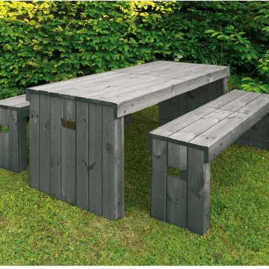 La table de pique-nique Amsterdam est pratique pour diner ou déjeuner à 6 personnes. Elle est en pin traité classe 3 et lasurée avec une couleur anthracite. Elle dispose d’un plateau central et de 2 bancs emboîtables sous la table. Cette table est fournie pré-assemblée.
